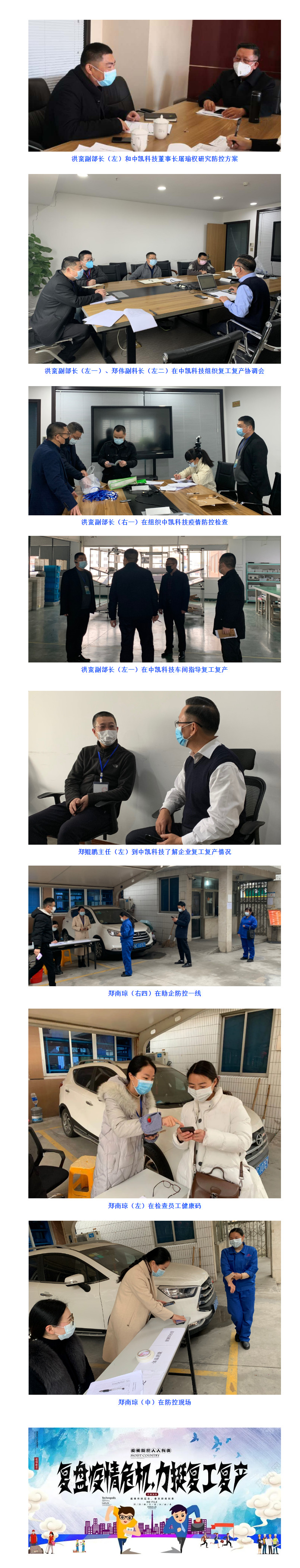 洪蠻副部長(zhǎng)公務(wù)繁忙,雖沒(méi)時(shí)間天天在企業(yè)蹲點(diǎn),但他心里從未放下企業(yè)。他無(wú)時(shí)無(wú)刻不在關(guān)心中凱科技的防控形勢(shì)和復(fù)工復(fù)產(chǎn)進(jìn)展,他每天要聽(tīng)取鄭偉副科長(zhǎng)和鄭南瓊的匯報(bào),看企業(yè)復(fù)工復(fù)產(chǎn)報(bào)表,對(duì)具體問(wèn)題要進(jìn)行分析判斷,提出對(duì)策和處理意見(jiàn),對(duì)下屬工作作出安排和部署。他經(jīng)常親臨企業(yè)復(fù)工復(fù)產(chǎn)現(xiàn)場(chǎng),陪同有關(guān)部門(mén)進(jìn)行防控檢查,與企業(yè)管理層探討防控方案,制定復(fù)工復(fù)產(chǎn)舉措,現(xiàn)場(chǎng)解決實(shí)際問(wèn)題。他是助企中凱科技復(fù)工復(fù)產(chǎn)的指揮者。