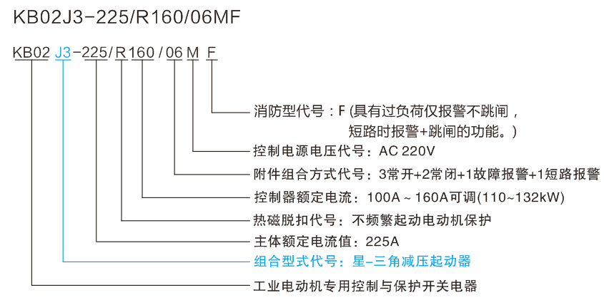 適用于電動機星-三角減壓起動的控制與保護(hù),以KB02產(chǎn)品作為主開關(guān),與塑殼斷路器、可逆接觸器、時間繼電器、電氣聯(lián)鎖及控制回路組合構(gòu)成星-三角減壓起動的控制與保護(hù)裝置。