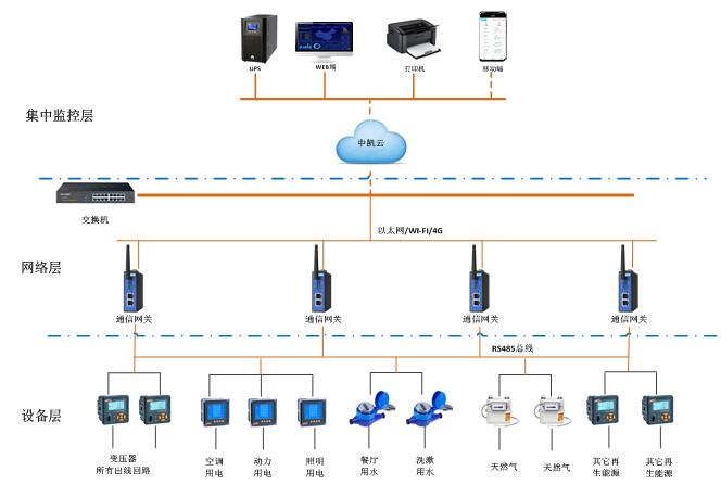 中凱能耗監(jiān)控系統(tǒng)基于中凱云平臺(tái),現(xiàn)場(chǎng)能耗監(jiān)測(cè)設(shè)備進(jìn)行能耗數(shù)據(jù)采集,通過(guò)智能網(wǎng)關(guān)組網(wǎng),將數(shù)據(jù)上傳至中凱云平臺(tái)。web端及移動(dòng)端app通過(guò)訪(fǎng)問(wèn)云服務(wù)器同步數(shù)據(jù),監(jiān)控系統(tǒng)實(shí)現(xiàn)數(shù)據(jù)監(jiān)測(cè)、分析、評(píng)估等功能。