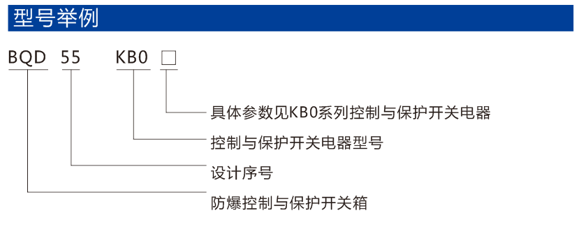 BQD55一KB0防爆控制與保護開關箱(以下簡稱開關箱)適用于ⅡB級T6組及以下級別、組別的爆炸性氣體混合物(1區和2區)場所。主要用于交流50Hz(60Hz),額定電壓至400V,開關箱額定電流至180A,各分路的電流至45A的電路中,對配電電路負載的控制與保護及對電動機不頻繁或頻繁起動、停止的控制與保護。